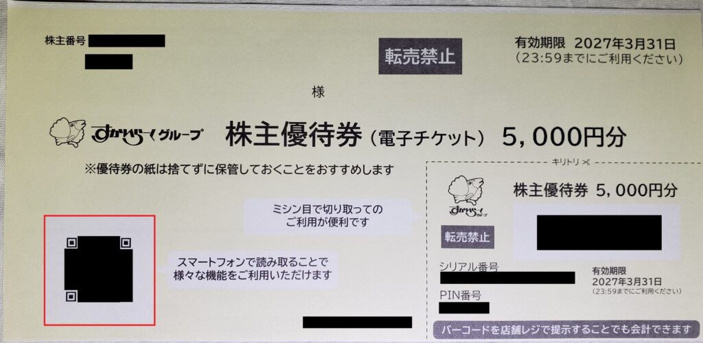 株主優待券の赤の部分、このQRコードをスマホで読み取ると