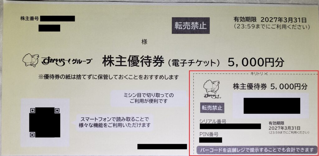 優待券の右下、赤い四角の部分、
