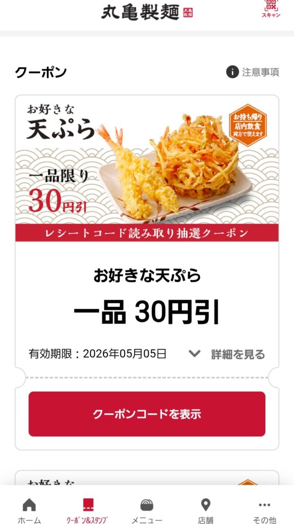 ということは、丸亀製麺アプリの「天ぷら30円引き」と